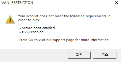 - 위 사진은 불량이나 정지가 아닙니다. 아시아서버 뱅가드는 한국과 다른 기준을 가지고 있기에 본인의 컴퓨터 보안설정을 바꾸라는 뜻입니다. 구글에 해당 코드들을 검색하시거나 '문의전 해결방법'글의 최하단에 해결 하는 방법이 적혀있습니다.